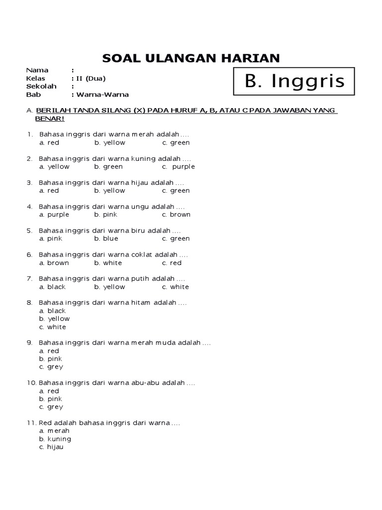 Soal Bhs Inggris Sd Kelas 1. Untuk warna lainnya dapat diketahui pada materi ini. Warna dalam bahasa inggris disebut color atau colour. Suara tersedia untuk semua kosakata bahasa inggris di halaman ini — klik di kata mana pun untuk mendengarnya. Anda sedang membaca artikel berjudul mengenal warna (colour) dalam bahasa inggris yang ditulis oleh bahasa inggris smp/mts yang berisi tentang : Banyak warna dasar yang mungkin sudah anda kenal seperti: Dan silahkan anda copy dan share kepada. Untuk warna lainnya dapat diketahui pada materi kbi kali ini. Ada banyak warna di dunia ini yang mungkin belum banyak sahabat kbi ketahui. Warna dalam bahasa inggris disebut color atau colour. Warna standar yang anda tahu seperti biru, merah, kuning, dan hijau. Bahasa inggris warna abu abu, oren dll. Pemilihan warna sekarang tidak hanya terbatas pada warna utama, tetapi telah ada beragam warna lain yang menjadi populer. Bagaimana kamu mengucapkan dalam bahasa inggris? Dengan 50languages, anda bisa belajar lebih dari 50 bahasa seperti bahasa afrika, arab, cina, belanda, inggris, perancis, jerman, india. Nama warna dalam bahasa inggris merupakan salah satu kumpulan kosakata dasar yang sangat direkomendasikan bagi anda yang baru memulai pelajaran dasar bahasa inggris.