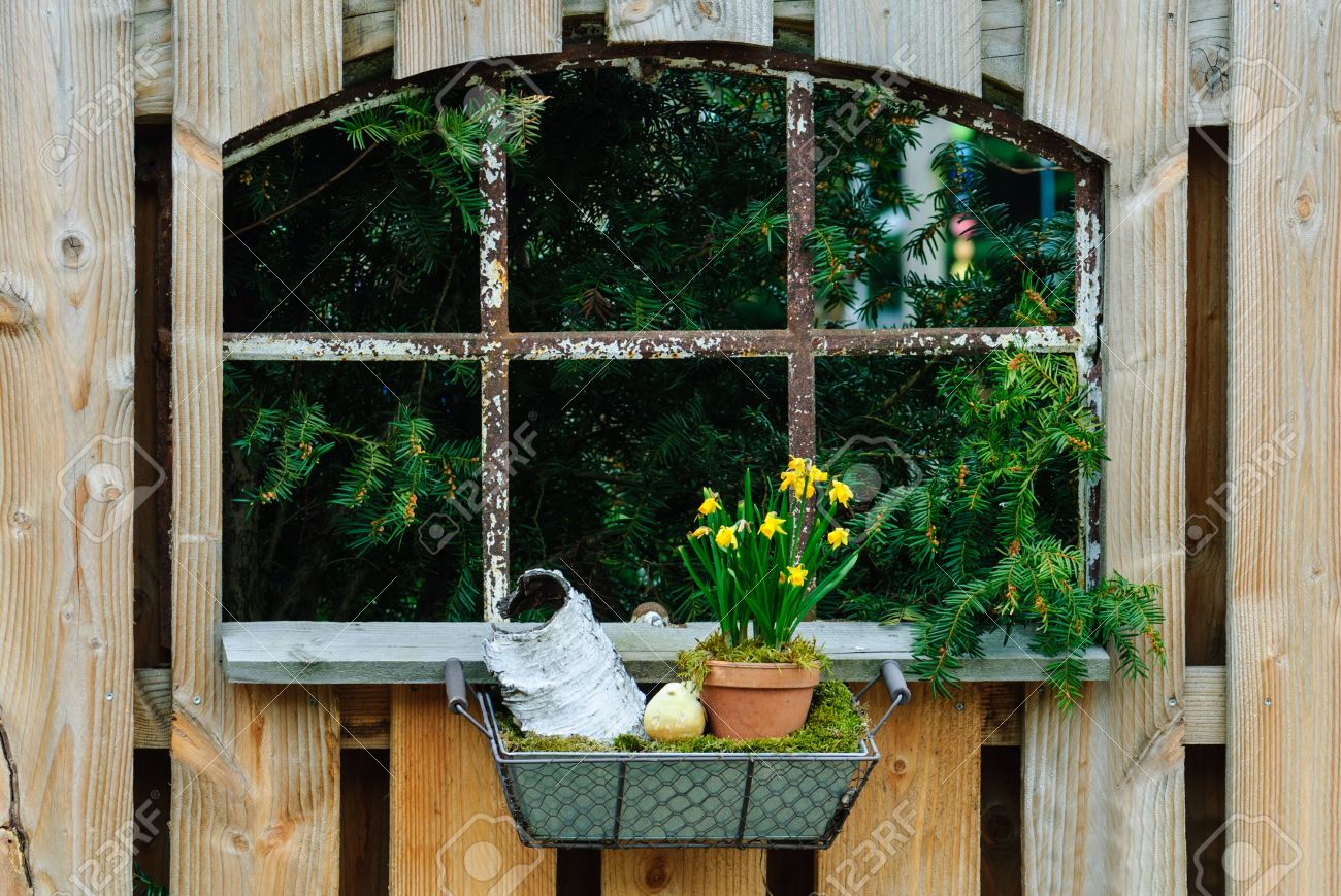 Alte Scheune Fenster In Einem Holzernen Gartenzaun Mit Dekoration In Einem Weidenkorb Lizenzfreie Fotos Bilder Und Stock Fotografie Image 19356712